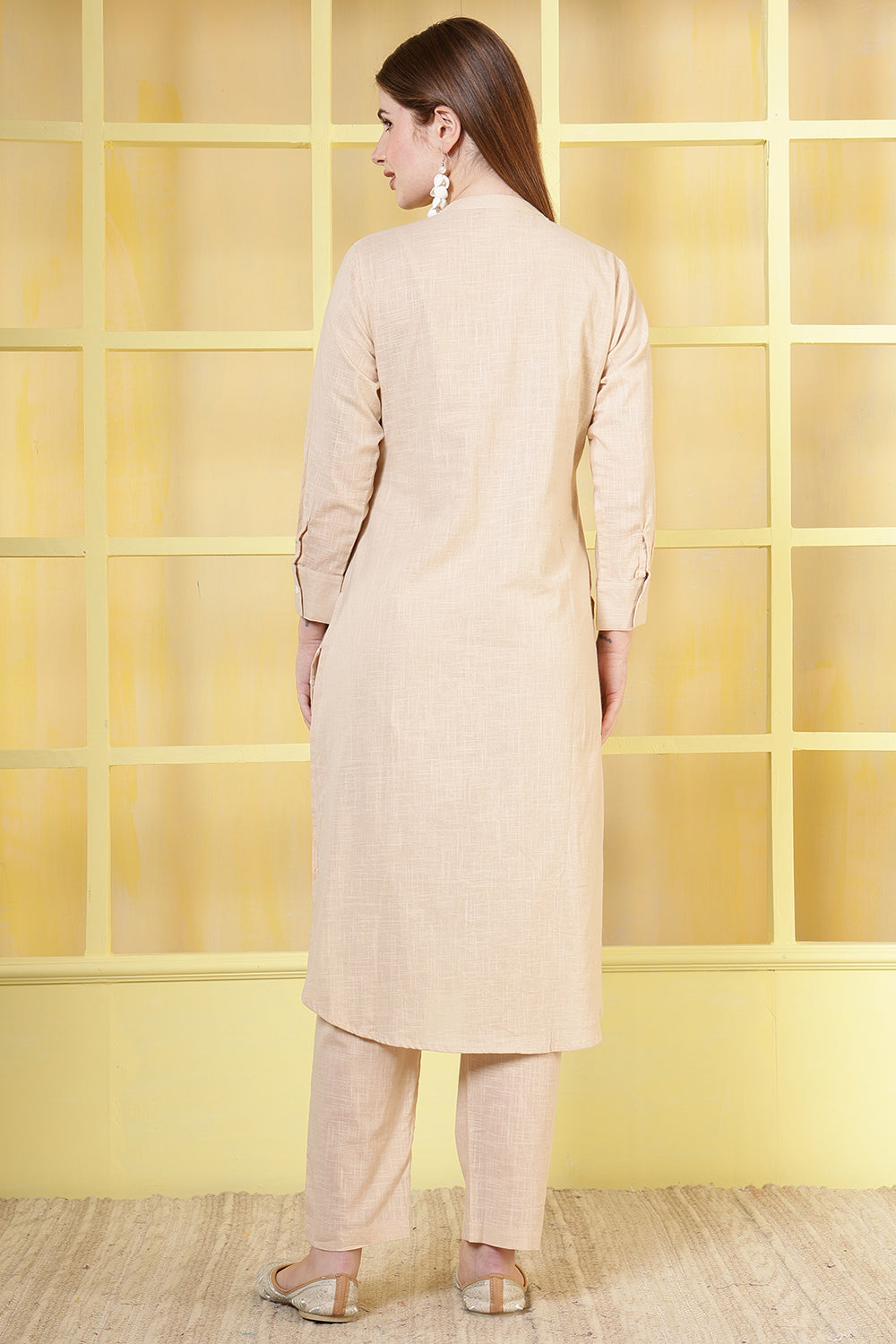 Beige Cotton Resham Embroidered Kurta Set