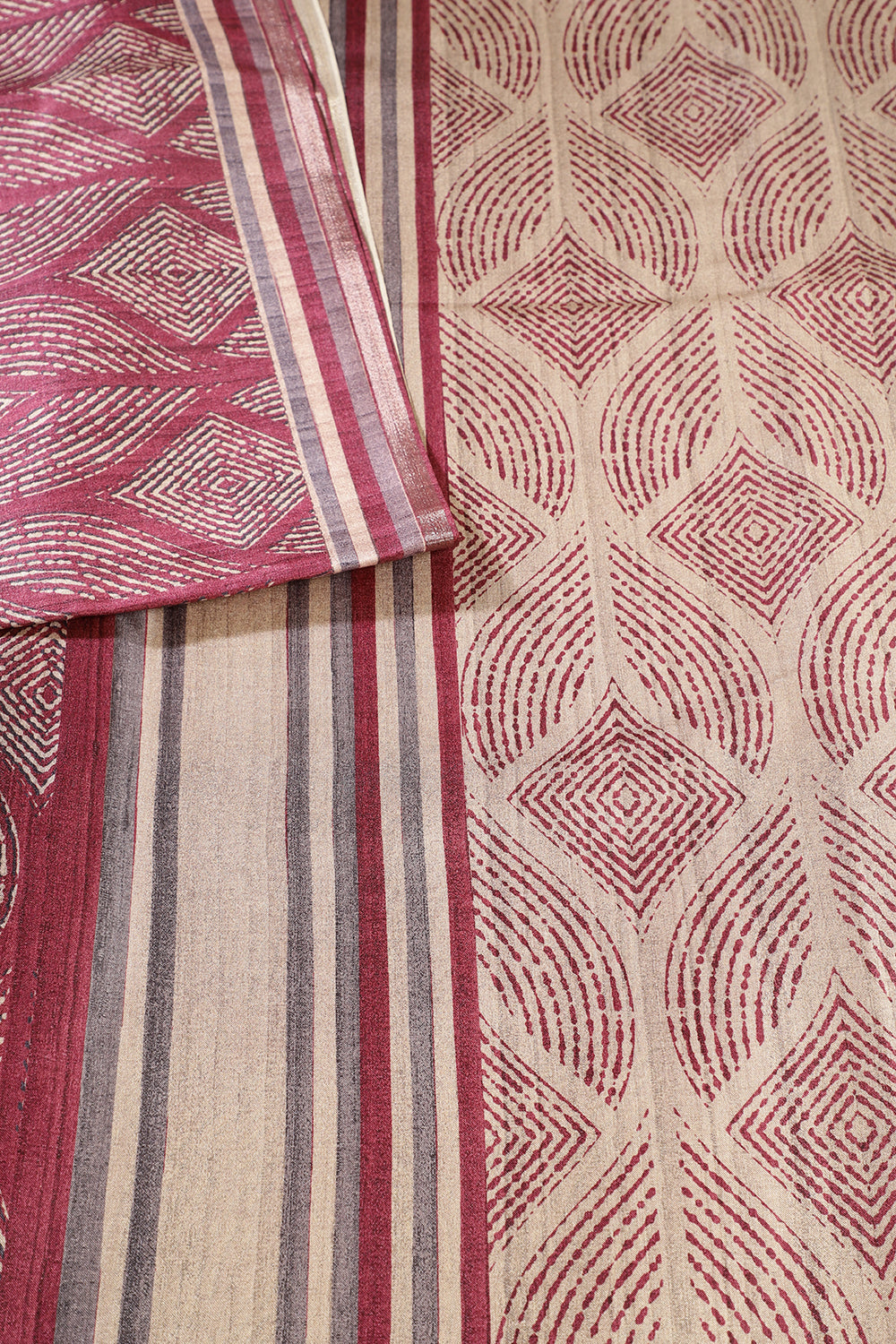 • Elevate your ethnic wardrobe with this exquisite Tussar Silk Printed Saree, a perfect blend of heritage craftsmanship and contemporary style.