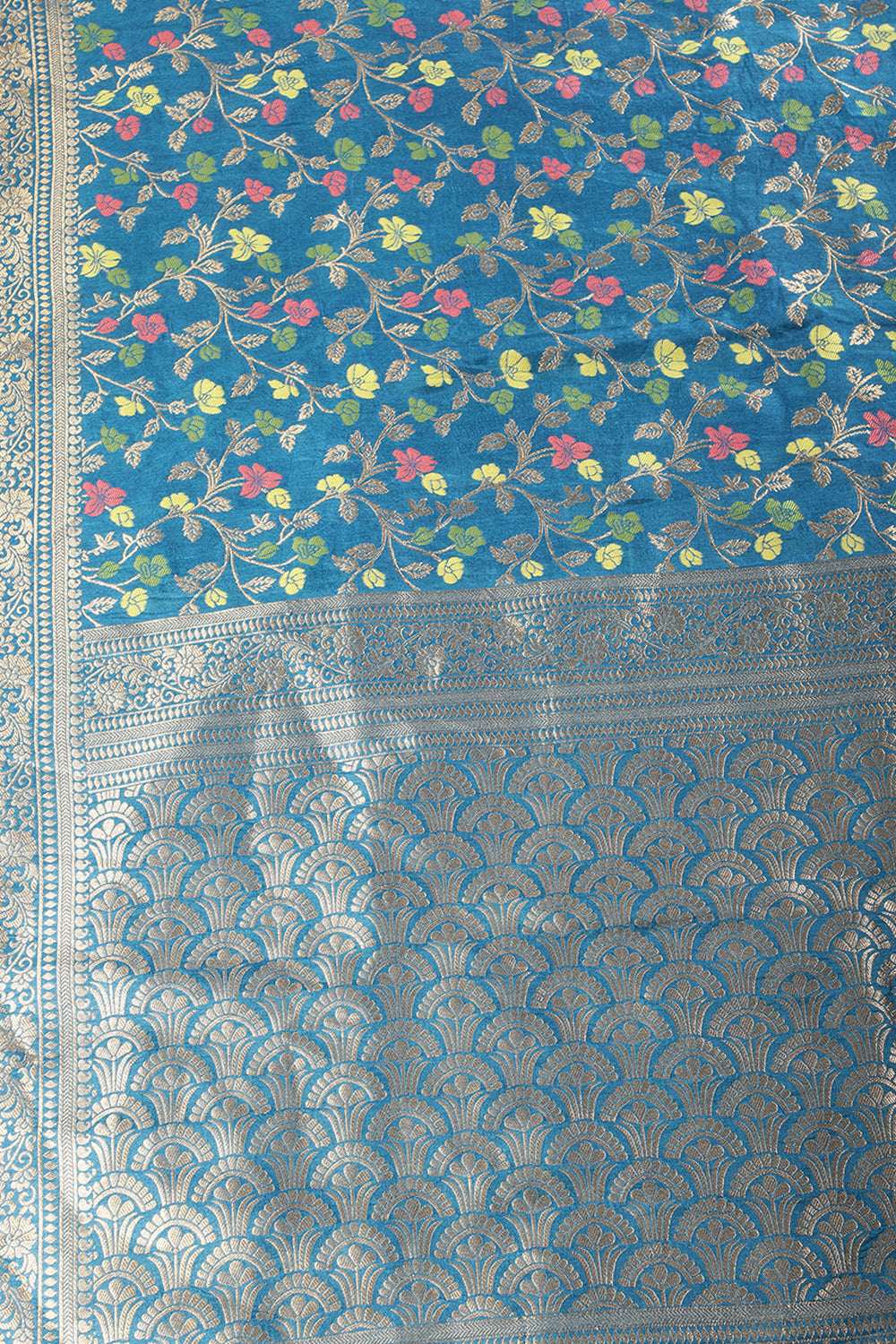 - Adorned with intricate zari borders and delicate resham floral weaving all over, this saree is a perfect pick for weddings, festive occasions, and special celebrations.