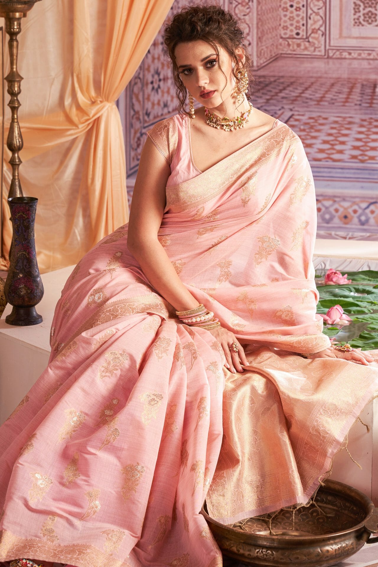 Wear a dash a heritage with this beautiful Zari woven Pink Colour Chanderi Saree. The saree is woven with Zari floral Motifs.