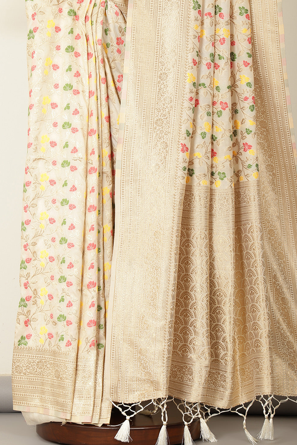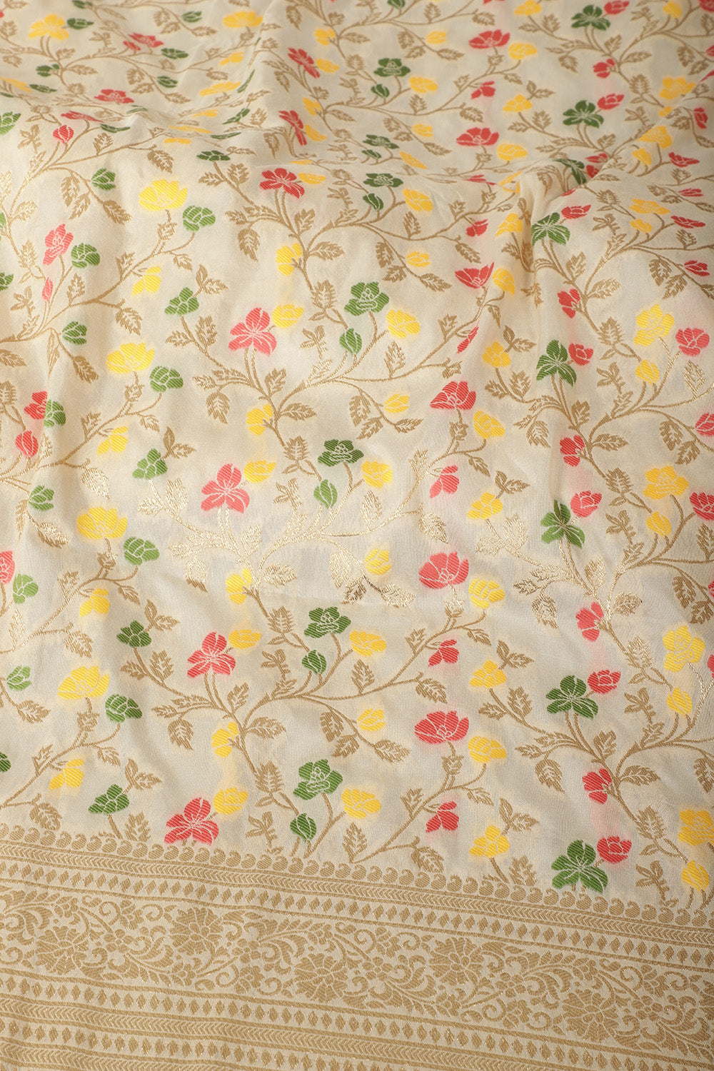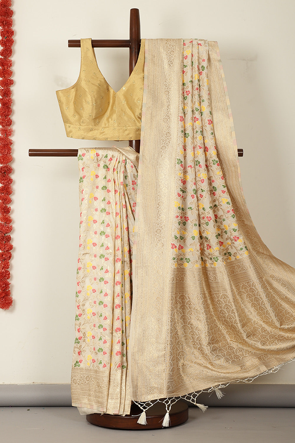 - Adorned with intricate zari borders and delicate resham floral weaving all over, this saree is a perfect pick for weddings, festive occasions, and special celebrations.