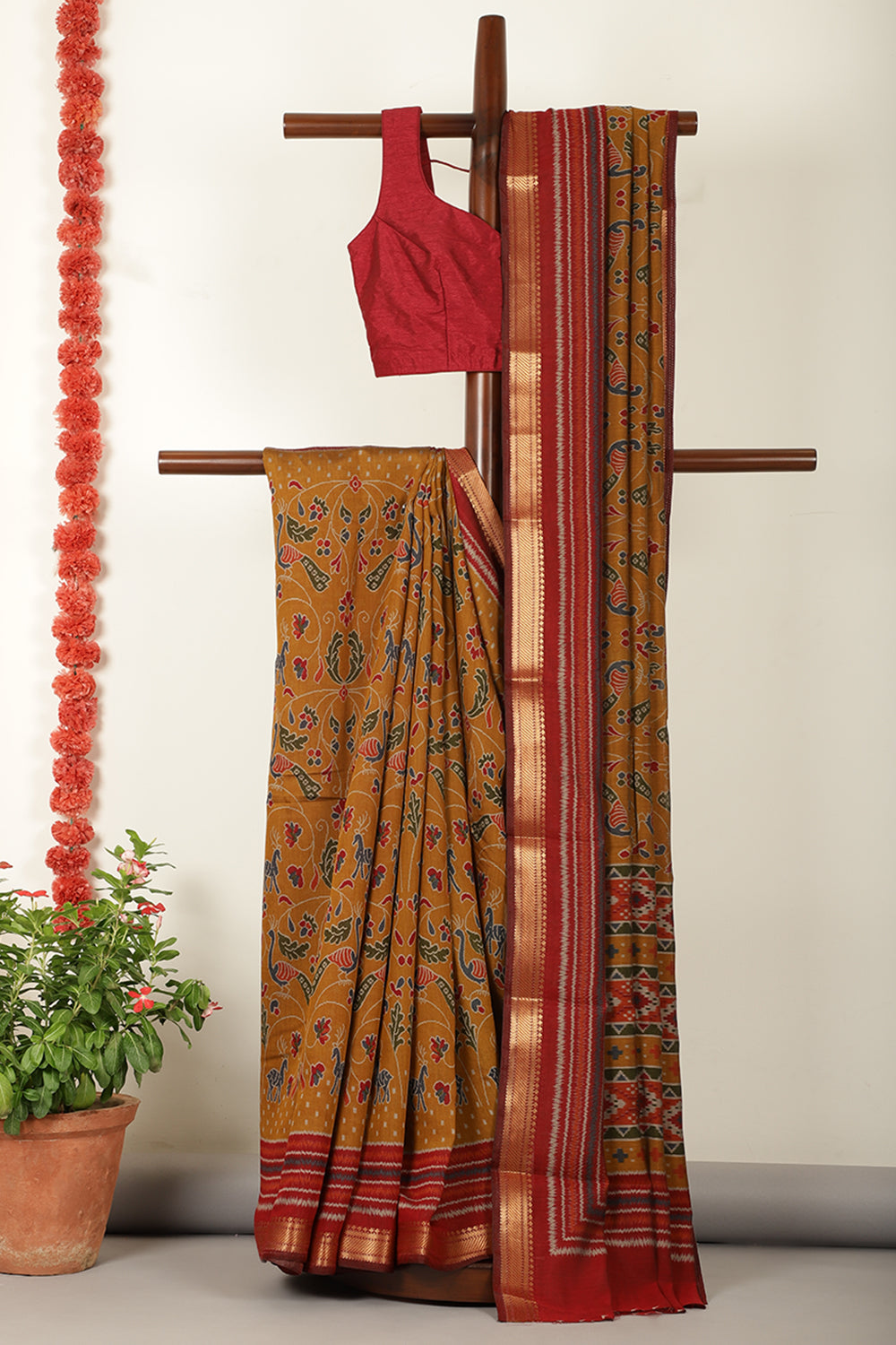 - Crafted from breathable cotton fabric, this elegant drape showcases hand-drawn style Kalamkari print work in earthy hues, beautifully enhanced with a rich zari woven golden border and pallu.