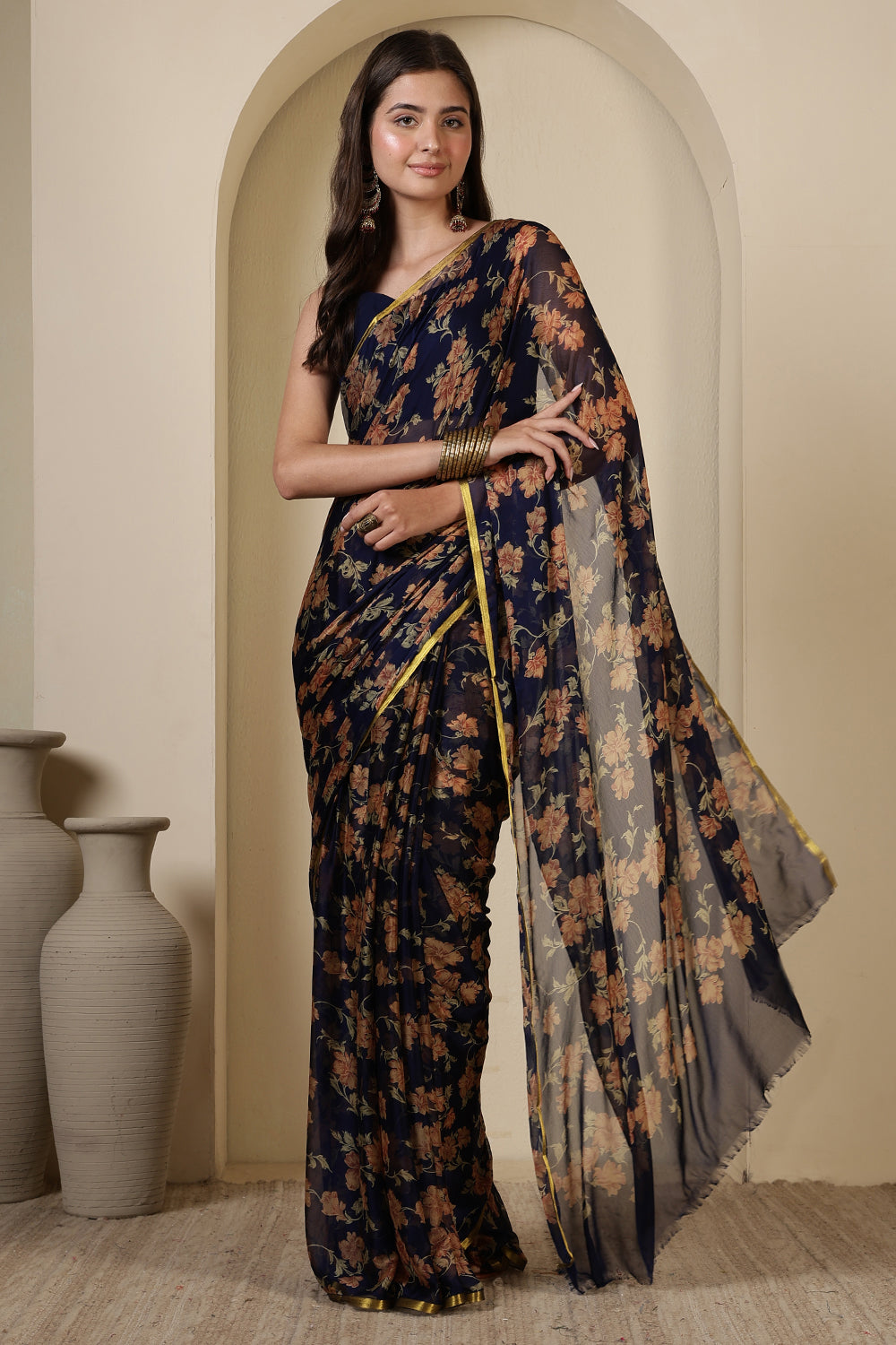 Navy Chiffon Floral Zari Border & Floral Printed Saree