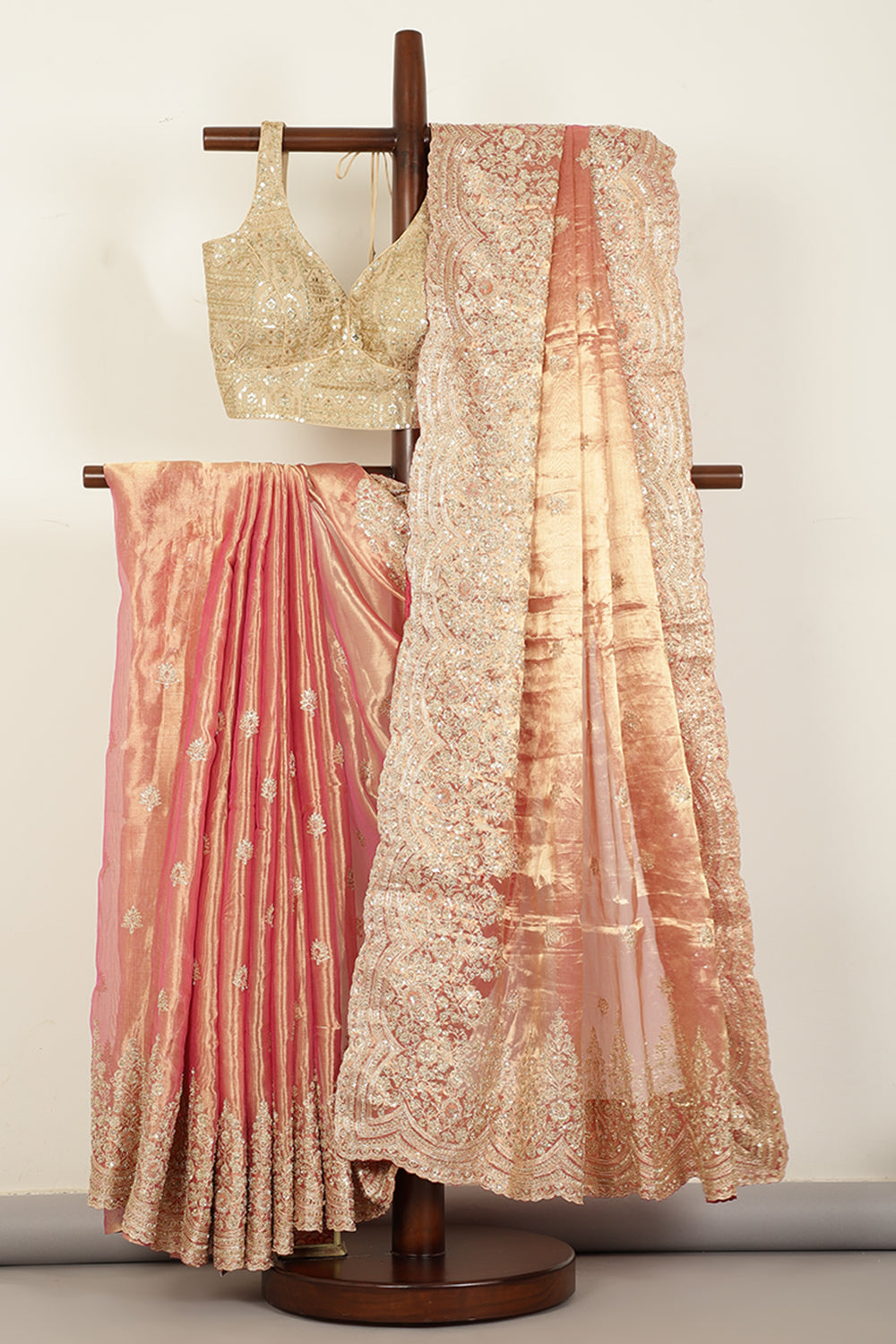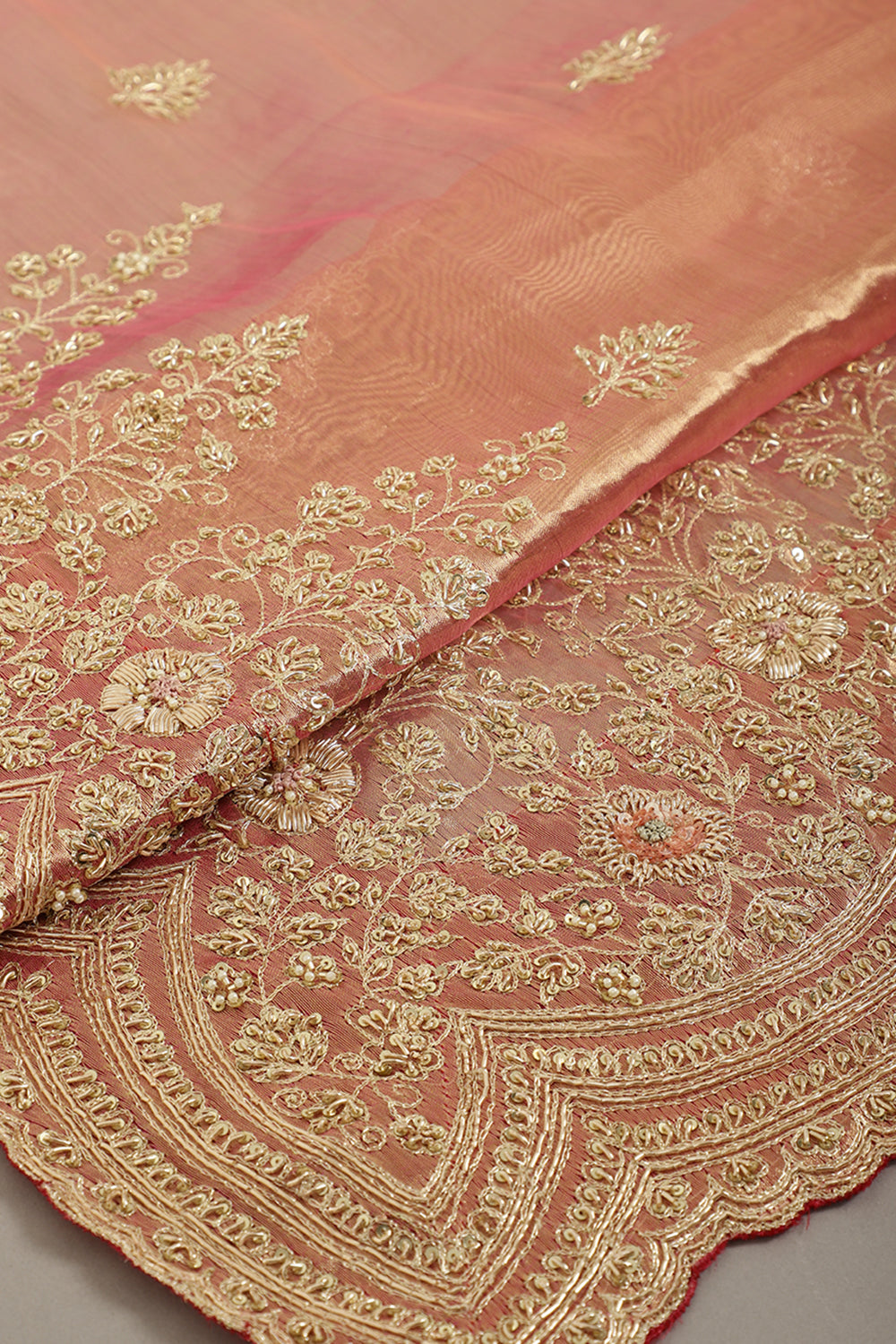 - Drape yourself in elegance with this stunning Pure Tissue Silk Saree, adorned with intricate Zardozi handwork. The smooth satin-crepe fabric lends a luxurious sheen and graceful fall, while the meticulous zardozi detailing adds a touch of royal charm. Perfect for weddings, festive occasions, and evening celebrations, this saree is a timeless addition to your wardrobe.