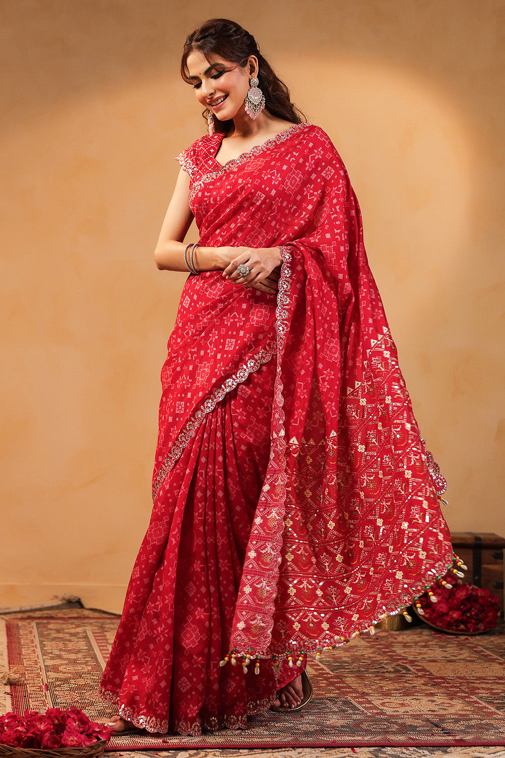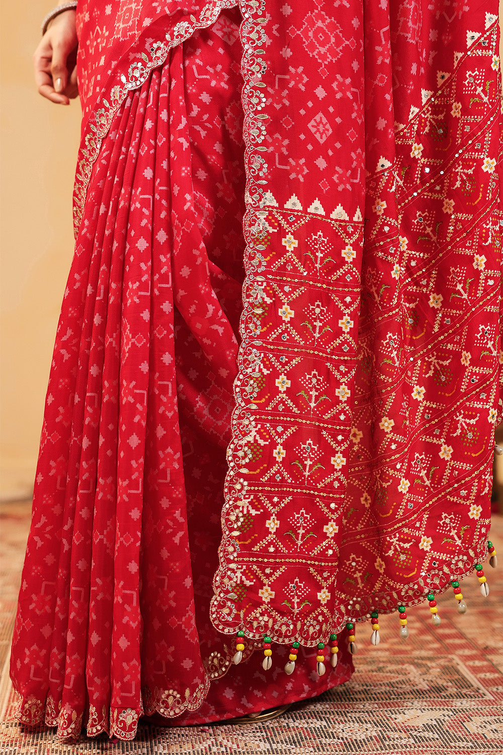 Red Color Ikat Patola Modal Silk Saree with Gota Patti Border